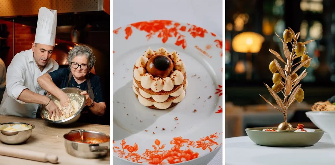 Every evening, Mamabella comes alive with the vibrance of Sicily, complete with traditional entertainment – from dancers to live instruments and the iconic tarantella – as flower petals rain across the room. The interiors echo the warmth of Mediterranean homes, blending high ceilings and dark woods with lush greenery and earthy beige tones. At its heart is a see-through glass kitchen, where guests can watch Chef Alessandro and his team at work. For those seeking a more intimate experience, a private dining kitchen with a panoramic view of the Burj Khalifa hosts up to 12 guests for exclusive cooking classes led by the visiting Nonnas.